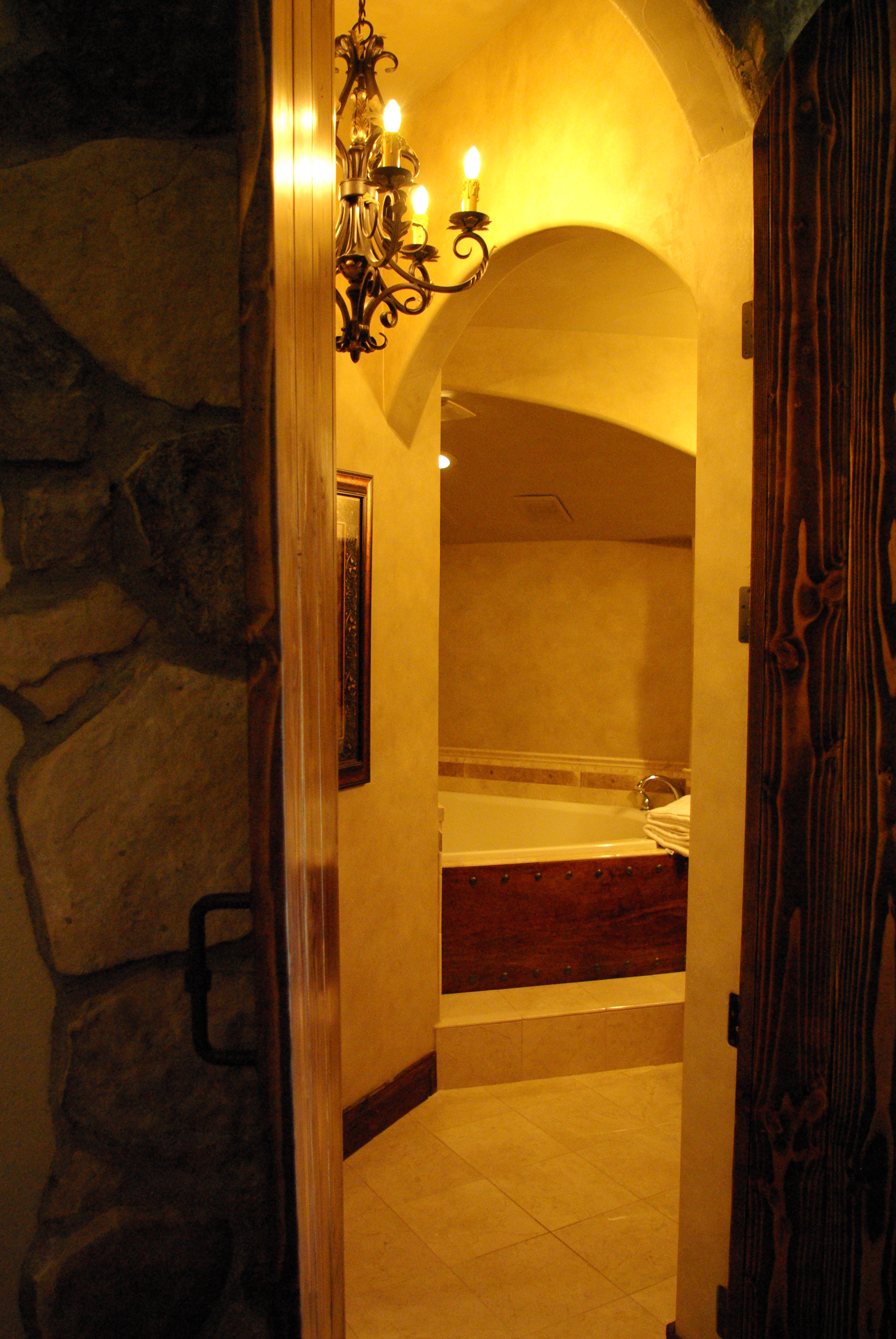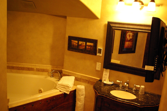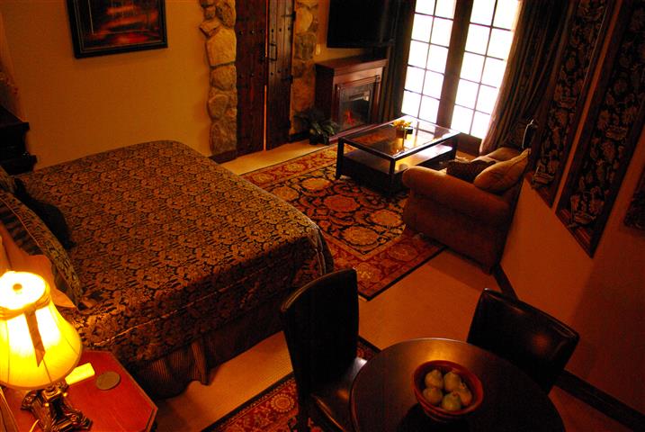 All of our rooms and suites offer more of a romantic getaway than most B&B;’s or hotels out there for less! Our guest rooms offer flat screen TV’s with DVD player and surround sound, bed massagers, mini fridge, coffee maker, zoned heat/AC, phone with private voicemail, WiFi, Hundreds of DVD’s to borrow and bags of popcorn, bath salts, fireplace, Jacuzzi tub, travertine stone bath, and more. Guest rooms are approximately 240 square feet. The suites offer the same amenities but everything is a little bigger. Big southern views, bigger TV’s, Bigger Jacuzzi tubs or private hot tub, bigger sitting areas. If you think a suite is a little out of your price range, we recommend staying in and ordering a pizza and bringing some wine to offset the cost of going out to dinner. This way you can have more time to enjoy the amenities Arrowhead has to offer and really relax and not have to worry about driving anywhere. Get settled in and just relax! Suites are 300­470 square feet.